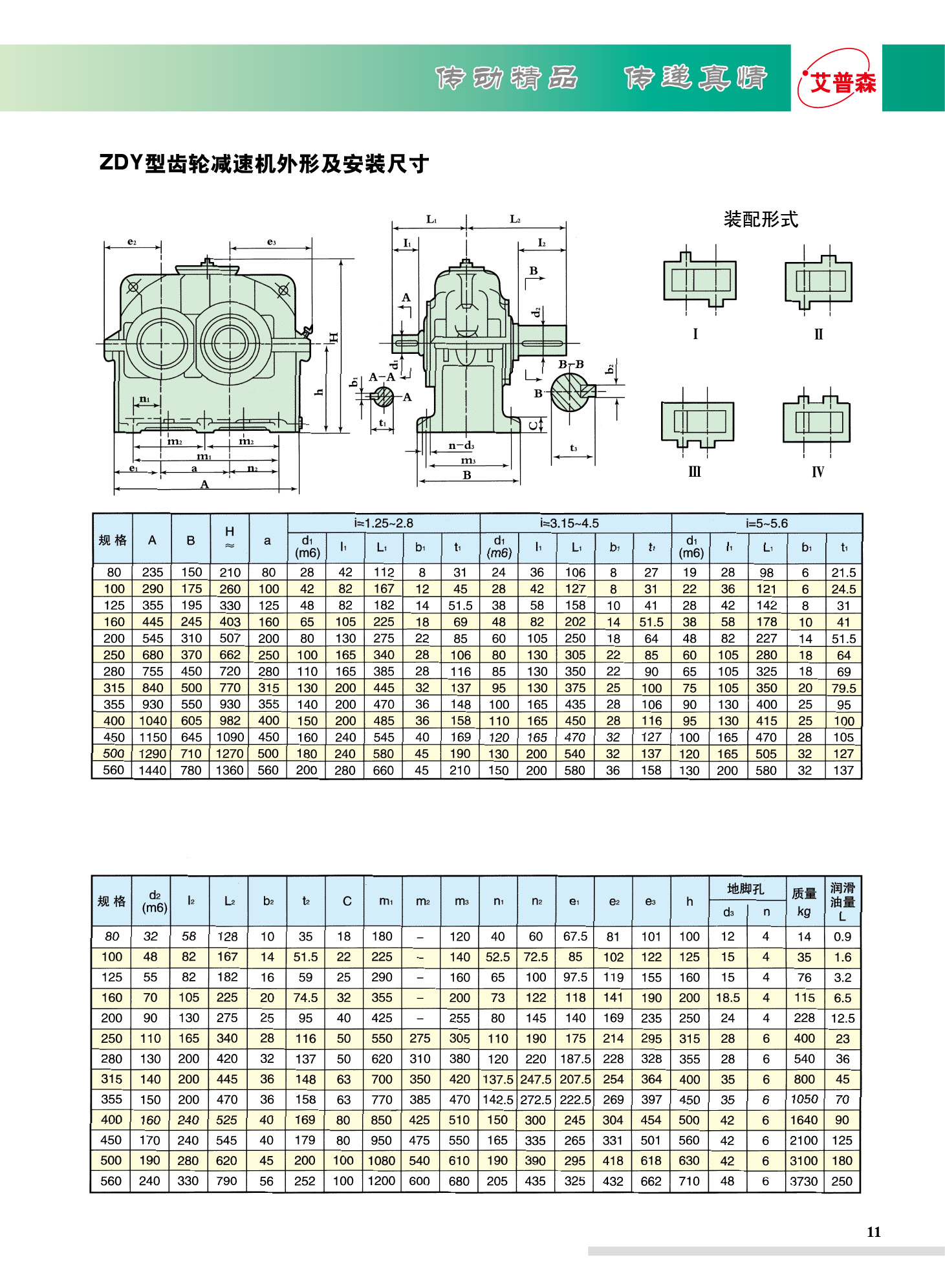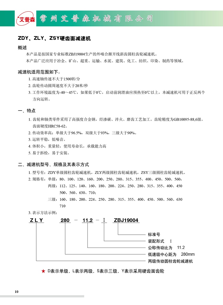 ZDY/ZLY/ZSY圓柱齒輪減速機(jī)減速機(jī)適用范圍如下: 1、高速軸轉(zhuǎn)不大于1500轉(zhuǎn)/分。 2、齒輪傳動圓周速度不大于20米/秒。 3、工作環(huán)境溫度為-40~+45℃,如果低于0℃,啟動前潤滑油應(yīng)預(yù)熱至0℃以上,本減速機(jī)可用于正反兩個方向運(yùn)轉(zhuǎn)。 一、特點(diǎn) 1.齒輪采用高強(qiáng)度低碳合金鋼經(jīng)滲碳淬火而成,齒面硬度達(dá)HRC58-62,齒輪均采用數(shù)控磨齒工藝,精度高,接觸性好。 2.傳動率高:單級大于96.5%,雙級大于93%,三級大于90%。 3.運(yùn)轉(zhuǎn)平穩(wěn),噪音低。 4.體積小,重量輕,使用壽命長,承載能力高。 5.易于拆檢,易于安裝。 ZSY三級圓柱齒輪減速機(jī)規(guī)格型號有:ZSY160.ZSY180.ZSY200.ZSY224.ZSY250.ZSY280.ZSY315.ZSY355. ZSY400.ZSY450.ZSY500.ZSY560.ZSY630.